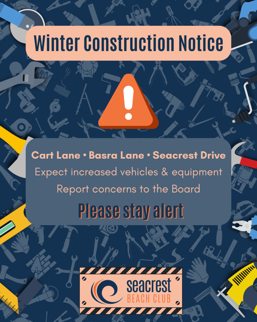 Please be advised that during the upcoming winter season, there will be multiple construction projects taking place within Seacrest Beach Club. Work will be occurring on Cart Lane, Basra Lane, and Seacrest Drive, and residents should anticipate an increase in construction activity, large vehicles, and equipment in these areas.